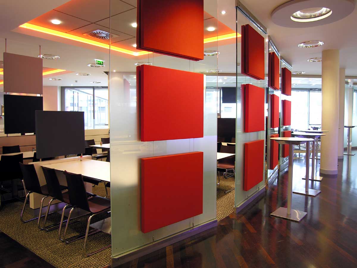 Tyto panely mohou být zavěšeny mezi stropem a podlahou nebo postaveny na stojanech, což znamená snadnou mobilitu pro oddělení a utlumení požadovaných prostor. Jsou navrženy tak, aby poskytly akustické řešení do rozsáhlých otevřených prostor odstíněním pracovišť a klidových zón. Jejich viditelné strany jsou pokryty textilní obálkou a v různých designových kombinacích vytvářejí velice zajímavý a originální výraz.